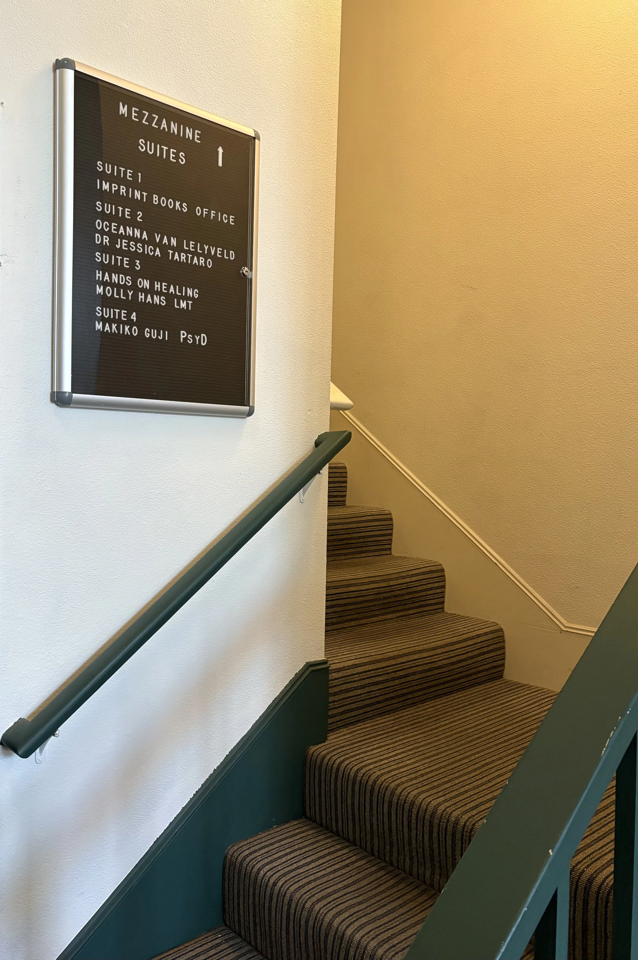 My office is located on the mezzanine level of the building. Enter 820 Water St, walk past the door to Imprint Books on the right hand side and proceed down the hallway. At the end you will see stairs on the right hand side. Walk up those stairs, there is a glass door at the top of the stairs straight ahead. Enter and you will be in our lovely waiting area.